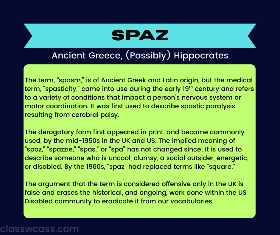 - “Origin and History of Spaz” from Online Etymology Dictionary