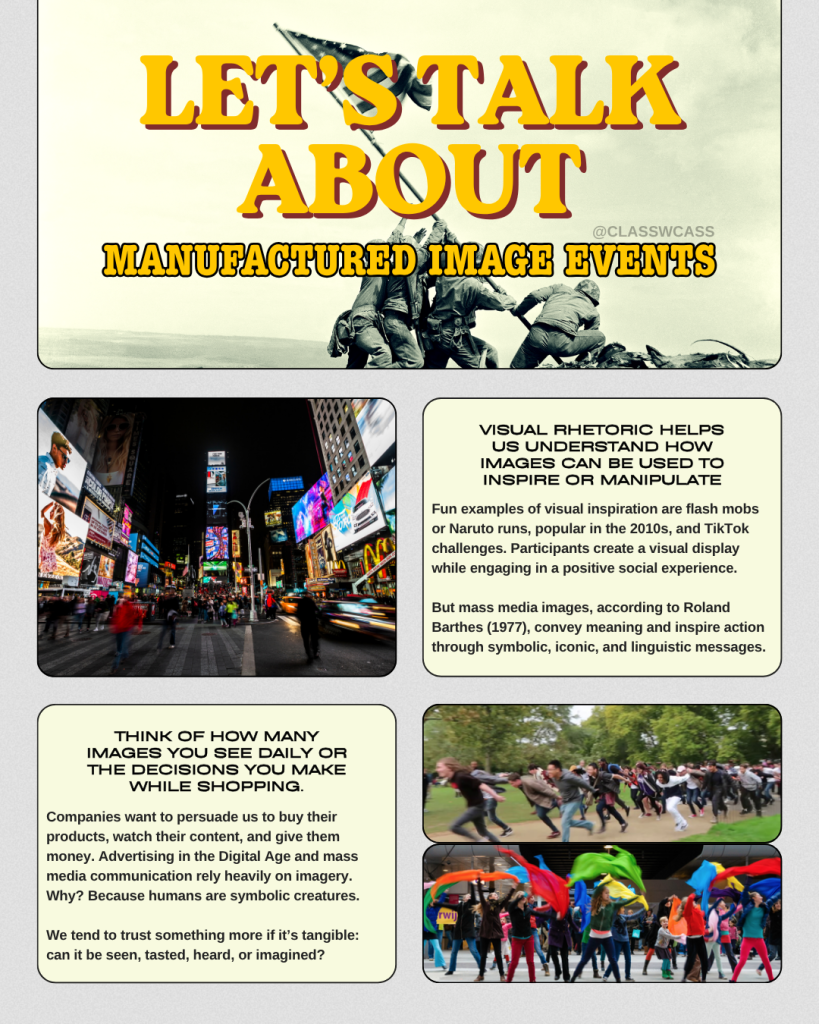Visual rhetoric helps us understand how images can be used to inspire or manipulate. Fun examples of visual inspiration are flash mobs or Naruto runs, popular in the 2010s, and TikTok challenges. Participants create a visual display while engaging in a positive social experience.