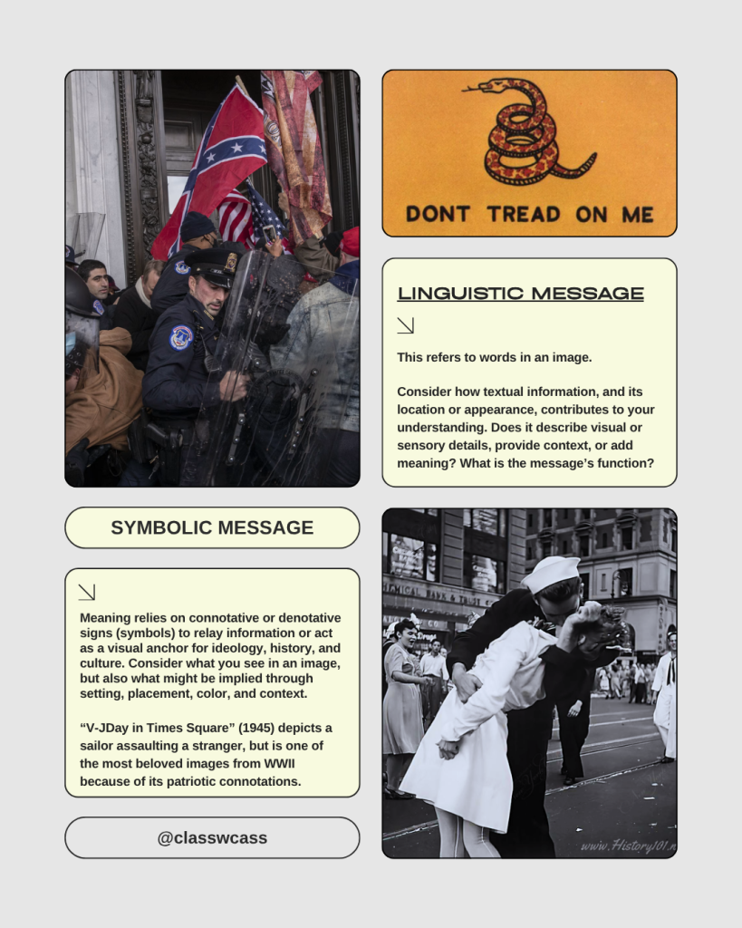 Meaning relies on connotative or denotative signs (symbols) to relay information or act as a visual anchor for ideology, history, and culture. Consider what you see in an image, but also what might be implied through setting, placement, color, and context.