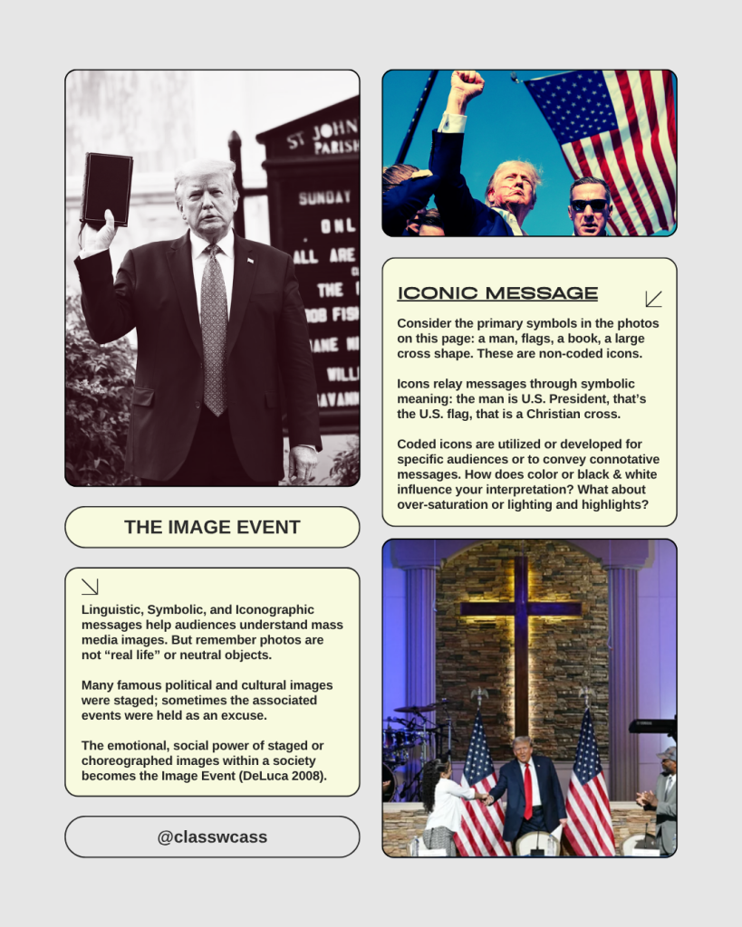 Icons relay messages through symbolic meaning: the man is U.S. President, that’s the U.S. flag, that is a Christian cross.