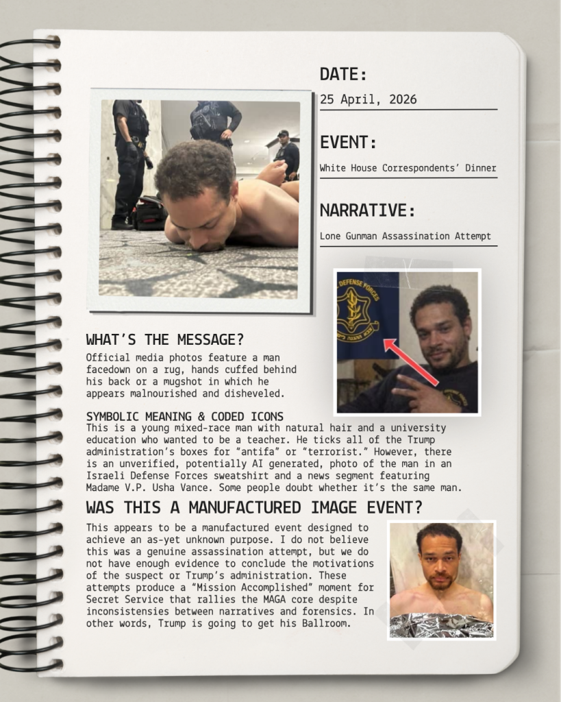 This appears to be a manufactured event designed to achieve an as-yet unknown purpose. I do not believe this was a genuine assassination attempt, but we do not have enough evidence to conclude the motivations of the suspect or Trump’s administration. These attempts produce a “Mission Accomplished” moment for Secret Service that rallies the MAGA core despite inconsistencies between narratives and forensics. In other words, Trump is going to get his Ballroom.